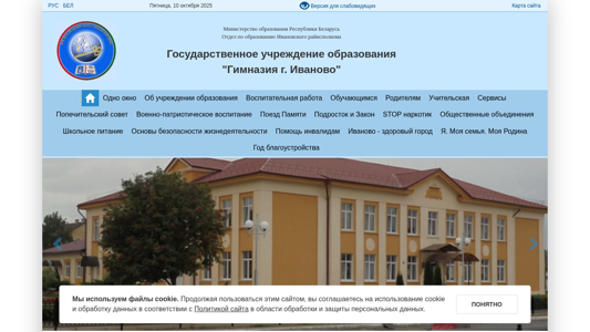 | AI-анализ | This website belongs to the "Гимназия г. Иваново" (Ivanovo City Gymnasium) in Belarus. The title and the description contain keywords related to education, such as "образования" (education), "учреждения" (establishments), "новости" (news), "классные" (excellent), and "детей" (children). The top words include the year "2025", "иваново" (Ivanovo), and phrases like "далее" (further), "читать" (read), and "быть" (to be). The website uses cookies and has options to change the font size, line spacing, and site color scheme. It also has a map of the site and various sections for information on the administration, educational procedures, and contacts. The ministry of education in the Republic |