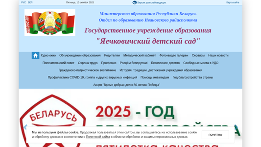 | AI-анализ | This website is for the Яечковичский детский сад, or "Yaechkovichsky Children's Garden," located in the Ivanovo region of Belarus. The title and description indicate that this is a children's educational institution. The keywords and top_words suggest that the website offers news, information about the school's schedule and programming, and possibly some form of preventative care or health education. The use of cookies is noted in the unp section. The domain is registered under the .BY top-level domain for Belarus. |