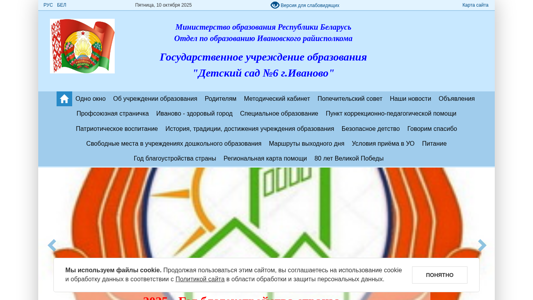| AI-анализ | The website <ddu6.ivanovo.edu.by> is titled "Детский сад №6 г.Иваново" (Children's Garden No. 6 in Ivanovo) and is associated with keywords related to education, Ivanovo city, kindergarten, and various other Russian and Belarusian words. The description section is empty. The top words include 'иваново' (Ivanovo), 'советы' (councils), and 'образования' (education), appearing frequently. The website uses cookies and is available in multiple languages, including Belarusian and Russian. |