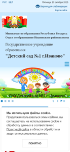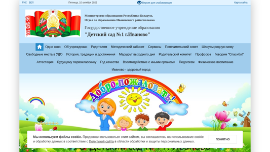 | AI-анализ | This online resource is a website for a kindergarten named 'Детский сад №1 г.Иваново' (Childcare Centre No.1 in Ivanovo, Belarus). The website provides information about the kindergarten, its size, location, and news. The title of the page is 'Детский сад №1 г.Иваново' and keywords include 'детский сад', 'сад', 'сайта', 'учреждении', 'дошкольного образования', 'иваново', and 'беларуская'. The most frequently used words are '2025', 'читать', 'далее', 'йская', 'образования', 'новости', 'нская', and 'учреждения'. The website is written in Belarusian language. The font size ranges from A to A+, |