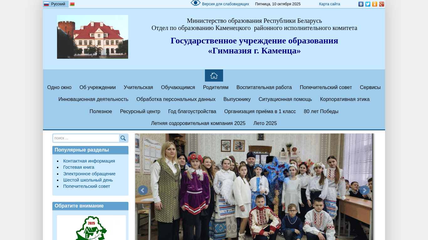 | AI-анализ | The portal gymn.kamenec.edu.by is the official website of the Gymnasium of the city of Kameneц, Belarus. It provides information about the institution, its structure, educational programs, and services. The website is operated by the Ministry of Education of the Republic of Belarus and the Kamenetsky District Executive Committee. The main sections of the site include 'About the Institution', 'Teaching Staff', 'Parents', 'Services', and 'Innovative Activities'. Users can find news, contacts, and information about enrollment and events. The website is available in both Russian and Belarusian languages. The design is standard with a clear layout and easy navigation. The site uses a medium font size and standard inter-character spacing. Images are turned off by default, with an option to switch to grayscale. The site includes accessibility features for vis |