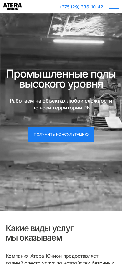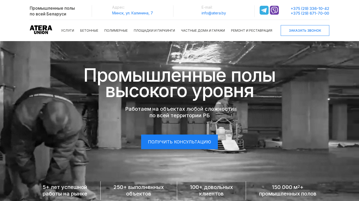 | SEO-описание | Компания Атера Юнион задает стандарт оказания услуг на рынке бетонных полов Беларуси. Полы, необходимые именно Вам. Весь спектр работ. Бонусы для наших клиентов |