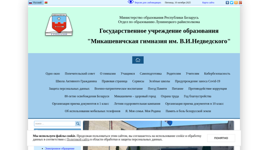 | AI-анализ | --- The portal "Микашевичская гимназия" (mikgim.luninec.edu.by) is a website belonging to the state educational institution "Микашевичская гимназия им. В.И.Недведского" in Belarus. The site offers information about the school, its educational programs, and various initiatives. The most frequent keywords include "2025", "читать" (read), "далее" (further), and "образования" (education), as well as terms related to the school, such as "язык" (language), "новости" (news), "9-11" (grades), and "беларусь" (Belarus). The site also features sections on cybersecurity, school activities, and student services. Users can find information about |
