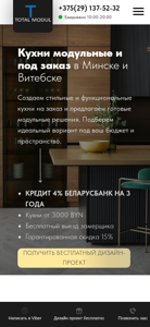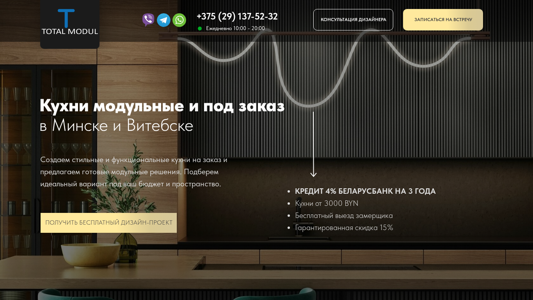 | AI-анализ | --- The portal t-modul.by offers modular and custom-made kitchens in Minске and at low prices. The specialist visits Minsk, Minsk region, and Vitebsk. Clients can consult with a designer and arrange a meeting every day from 10:00 to 20:00 by calling +375 (29) 137-52-32. The website provides answers to frequently asked questions, including the calculation of a kitchen under credit from Belarusbank with a 15% discount and a 4% annual interest rate over three years. All kitchens can be purchased in credit with a maximum loan of 12,000 BYN and a term of up to three years without collateral. Clients can also request a free design project and consultation with a designer. The company offers both modular kitchen solutions and custom |