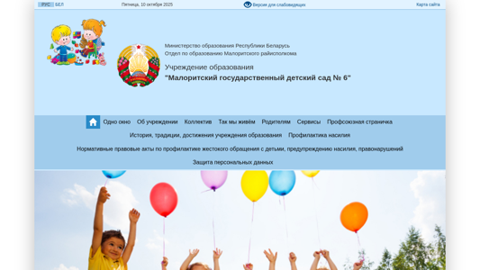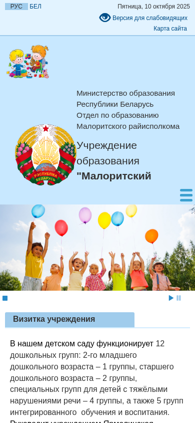 | AI-анализ | This website is the official page of the "Малоритский ясли-сад 6" (Maloritsky Yasli-Sad 6, or Malorit Kindergarten No. 6) run by the Ministry of Education of the Republic of Belarus in Malorita, Belarus. The website provides information about the kindergarten, its schedule, staff, and educational programs for children from preschool age. Visitors can find the working hours of the administration, contact details, and procedures for various administrative tasks. The website also features a photo gallery of the kindergarten and its staff, as well as a history of the institution. The kindergarten's mission is to ensure quality education and care for children during the preschool years, with a focus on safety, music, and various support services for both children and their parents. The website is accessible in both Russian |