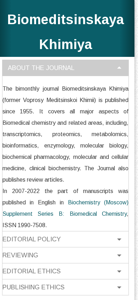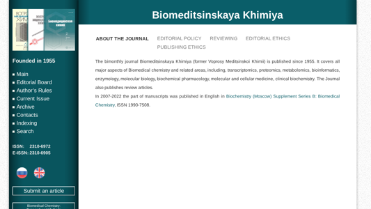| AI-анализ | This website is for the bimonthly scientific journal "Biomeditsinskaya Khimiya," which has been published since 1955. The journal focuses on all major aspects of biomedical chemistry and related areas, including transcriptomics, proteomics, metabolomics, bioinformatics, enzymology, molecular biology, biochemical pharmacology, molecular and cellular medicine, and clinical biochemistry. The journal also publishes review articles. In cooperation with a new publishing project, methodological articles should be sent directly to the editorial board of "Biomedical Chemistry: Research and Methods." The journal follows a peer-reviewed process and is indexed. It has sections for experimental research, clinical and diagnostic research, and reviews. Experimental research papers publish the results of classical experimental and computational studies. Clinical and diagnostic research must include |