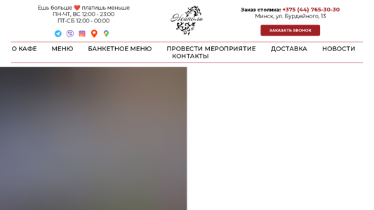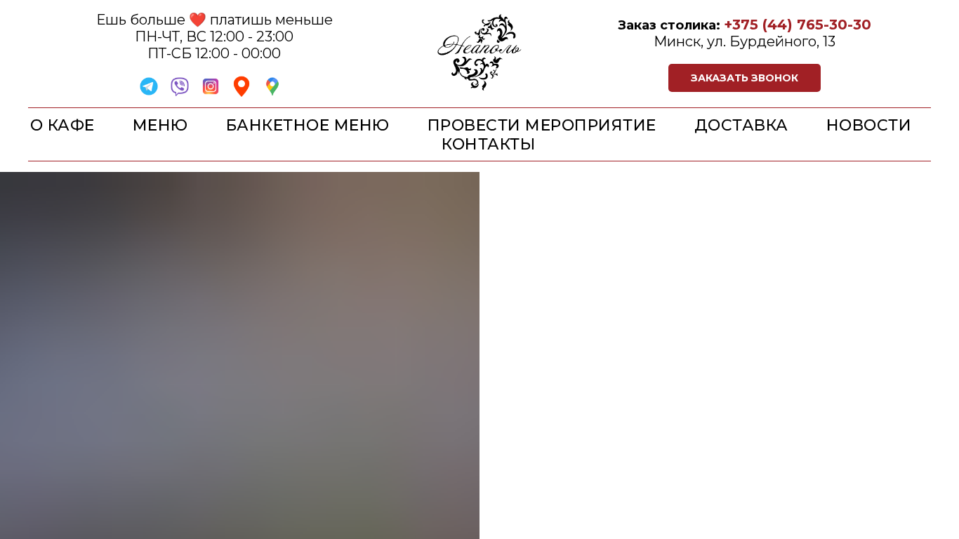 | AI-анализ | This website belongs to a cafe named "Neapol" located in Minsk, Belarus, at ul. Bурдейного, 13. The website offers menu and pricing information, as well as the ability to book a table and organize various types of events such as weddings, birthdays, corporate or business lunches. The cafe has two banquet halls that can accommodate 120 and 40 people respectively, with separate entrances and a rooftop terrace. The cafe is open Monday through Thursday from 12:00 to 23:00 and Friday through Sunday from 12:00 to 00:00. Customers can place a table reservation by calling +375 (44) 765-30-30. The cafe features a stylish European interior, a tasty menu, a |