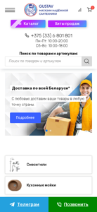 | AI-анализ | The website is an official e-commerce platform for the plumbing and bathroom fixtures retailer 'Густав' in Minsk, Belarus. The store offers a variety of products including mixers, drains, kitchen and bathroom sinks, installation systems, sanitary ware, shower cabins, bathtubs, and related accessories. Customers can browse the catalog, make purchases, and contact the store using the provided phone number. The site includes a search function and categories for popular items, such as kitchen and bathroom sinks, installation systems, and sanitary ware. Delivery and payment options, as well as a FAQ section and company information, are also accessible on the website. |