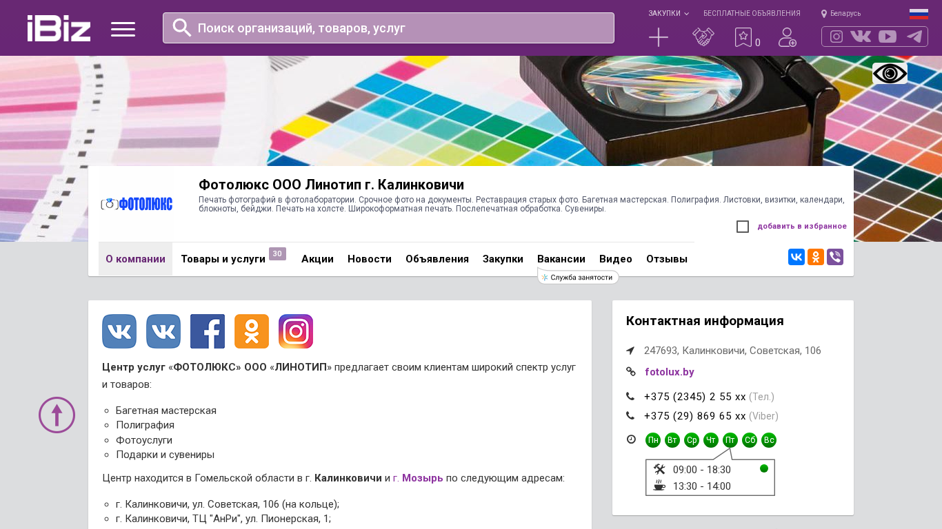 Название / Заголовок | Фотолюкс ООО Линотип г. Калинковичи - Печать фотографий в фотолаборатории. Срочное фото на документы. Реставрация старых фото. Багетная мастерская. Полиграфия. Листовки, визитки, календари, блокноты, бейджи. Печать на холсте. Широкоформатная печать. Послепечатная обработка. Сувениры.. 247693, Калинковичи, , Советская, 106 |