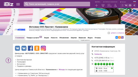 AI-анализ | This website is a photography and printing service based in Kalinkovichi, Belarus. The business, named Фотолюкс ООО Линотип, offers photo printing in a lab, urgent photo printing on documents, photo restoration, and a bakery. It also provides polygraphic services, including the production of flyers, business cards, calendars, notebooks, badges, and printing on canvas and large formats. The website includes a map with contact information for the company at 247693, Советская, 106 in Kalinkovichi. Additionally, the site features free classified ads for buying and selling items. |