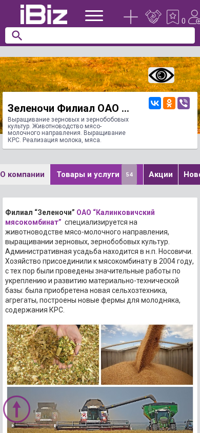 | Название / Заголовок | Зеленочи Филиал ОАО Калинковичский мясокомбинат - Выращивание зерновых и зернобобовых культур. Животноводство мясо-молочного направления. Выращивание КРС. Реализация молока, мяса.. 247707, , Носовичи д., Советская, 107 |
