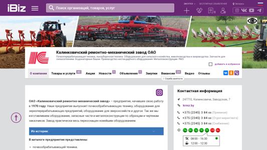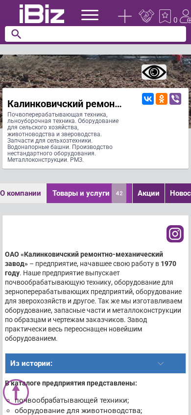 | AI-анализ | The web project "Калинковичский ремонтно-меchanical plant OAO" specializes in manufacturing and selling post-harvest agricultural equipment, льно-harvesting equipment, machinery and equipment for livestock farming, fur farming, and agriculture in general. Additionally, they produce non-standard equipment, metal structures and water storage tanks. The plant is located in Calinovichi, Belarus, at Zavodskaya street, number 7. |