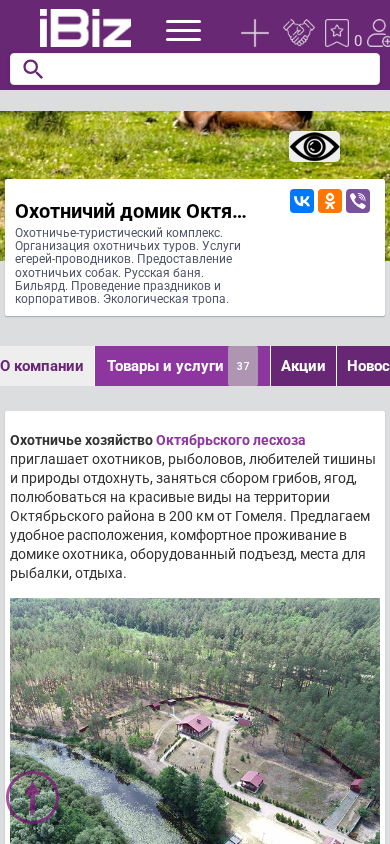 | Название / Заголовок | Охотничий домик Октябрьский лесхоз - Охотничье-туристический комплекс. Организация охотничьих туров. Услуги егерей-проводников. Предоставление охотничьих собак. Русская баня. Бильярд. Проведение праздников и корпоративов. Экологическая тропа.. 247319, , Поречский c/c, 1/1 |