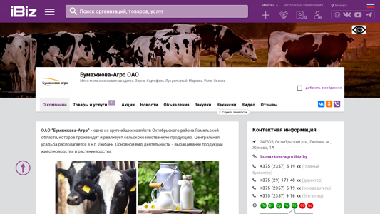 | AI-анализ | The website is for OAO "Бумажкова-Аgро," a large agricultural enterprise located in the October District of the Homiel Region in Belarus. The main activities of the company include livestock farming and crop production. Products and services offered include livestock, raw milk, meat and dairy products, vegetables such as onion, carrot, beet, and rapeseed. Additionally, the company grows grains and legumes. The central farmstead is located in the settlement of Luban. The enterprise comprises cattle farms, milk processing facilities, repair workshops, garages, apartment buildings, and a transportation fleet. The livestock sector is the main source of income for the company, with milk sales being the primary revenue generator. The company also produces feed for agricultural animals. High-quality agricultural products and affordable prices are guaranteed. Potential partners are welcomed. The website provides a map and |