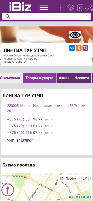 | Название / Заголовок | ЛИНГВА ТУР УТЧП - Услуги бюро переводов. Услуги бюро туризма. услуги бюро по трудоустройству. . 220005, Минск, , Независимости пр-т, 58/9, офис 301 |