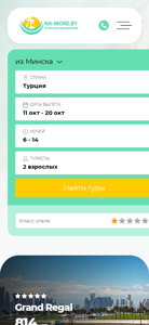 | AI-анализ | --- This website is for a Belarusian tourism company named "Na-more.by". The homepage displays their main services, which include tour pickup, country selection, and hotel booking. The website offers tours to various countries such as Turkey, Egypt, the UAE, and Georgia. Users can filter tours based on country, dates, number of tourists, and hotel class. The website provides detailed information about each tour, including the number of nights, tour price, hotel name, and location. Users can also find contact information for the company, located in Minsk, Belarus. The website has received a high rating of 5.0 stars based on 75 reviews. Keywords associated with the website include "minska", "usd", "окт", "ночей", "eur", "все", "туры", "турция", "море", "оаэ |