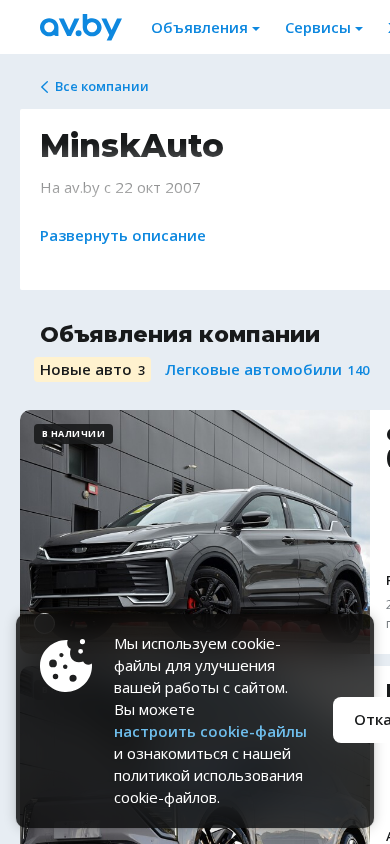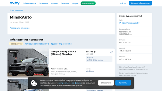 | AI-анализ | The portal MinskAuto is an automotive marketplace where all announcements originate from MinskAuto. The website provides contacts, working hours, and reviews about MinskAuto. Cookies are used to improve user experience with the site, and users can configure cookie settings and view the cookie usage policy. The site offers various categories of vehicles for sale, including new and used cars, electric vehicles, commercial vehicles, motorcycles, agricultural equipment, and special equipment. Additionally, there are services such as vehicle inspections, financing, and appraisals. Companies related to MinskAuto can be found on av.by since October 22, 2007. Users can buy or sell cars with credit or leasing options, and there are consultations available on various topics like "How to buy a car?" and "How to sell a car?". The company also offers auctions from Western European |