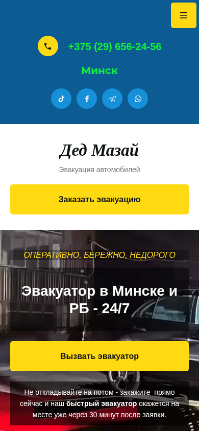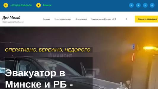 SEO-описание | Быстро и надежно эвакуируем автомобили по всему Минску. Круглосуточно доступные услуги эвакуатора по демократичным ценам. Звоните сейчас! +375 (29) 656-24-56 |