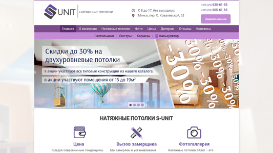 | AI-анализ | This online resource is dedicated to offering a wide range of stretch ceilings and optimal prices in Minsk, Belarus. With availability from 8 a.m. to 5 p.m., Monday to Friday, customers can contact the company at two provided phone numbers for ordering or inquiries. The website includes sections for company information, photo galleries, pricing, dealers, testimonials, lighting fixtures, chandeliers, carpentry, and a calculator. The main offerings are stretch ceilings from S-Unit, which are presented as a stylish and non-standard interior solution. The website provides information about various types of stretch ceilings, including glossy, matte, satin, and canvas options, as well as artistic and multi-level designs. |