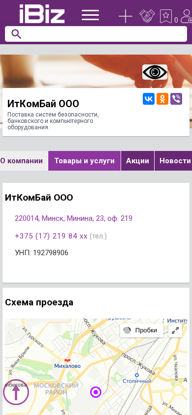 | Название / Заголовок | ИтКомБай ООО - Поставка систем безопасности, банковского и компьютерного оборудования.. 220014, Минск, , Минина, 23, оф. 219 |