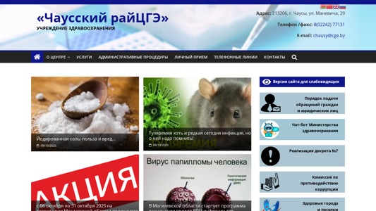 | AI-анализ | --- This online resource is the official website for the 'Chaussky raytsge' health institution located in the city of Chausy, Belarus. The title of the website is 'Чаусский райЦГЭ — УЧРЕЖДЕНИЕ ЗДРАВООХРАНЕНИЯ' which translates to 'Chaussky raytsge — Учреждение здравоохранения' or 'Chaussky raytsge — Health Institution'. The description section of the website includes information about the center, its address, and contact details. The keywords associated with the website include 'cge', 'новости' (news), 'chay' (Friday), 'райцгэ' (raytsge), 'здравоохранения' (healthcare), and 'учреждение |