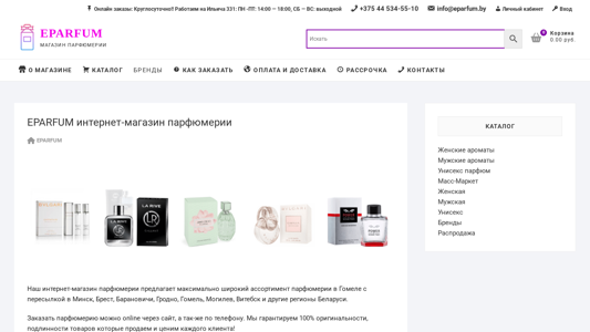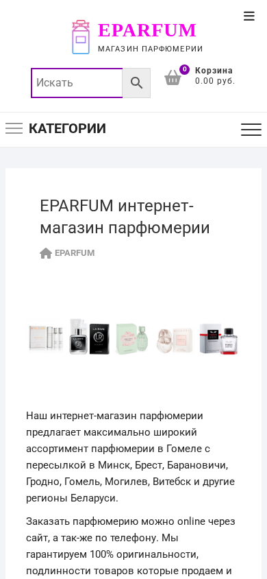 | SEO-описание | Рады приветствовать Вас в интернет-магазине EPARFUM ✅ Парфюмерия Оригиналы ✅ Туалетная вода мужская ✅ Духи женские ✅ Арабская парфюмерия ✅Бюджетная парфюмерия ✅ Парфюмерия отливант 2, 5, 10 мл ✅ Отправляем по РБ в день заказ почтовыми службами Европочта, Белпочта, оплата при получении. |