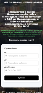 | AI-анализ | The portal na-vitebsk.by is a taxi service website for the routes Novopolotsk-Vitebsk-Novopolotsk. The website provides information on the schedules, pricing, and booking for these routes, which operate from Monday to Friday. Passengers can make online reservations up to five days prior to travel, between 7:00 AM and 8:00 PM on the day before departure. Reservations on the day of travel must be made by phone or at the bus station counter. The cost of a one-way trip is 14 rubles. The website includes a list of stops, such as the bus station, hotels, schools, and other popular locations in Belarus and the city of Minsk. Online ticket purchase is available from the listed locations. The website is operated by OOO "Goutuvit". |