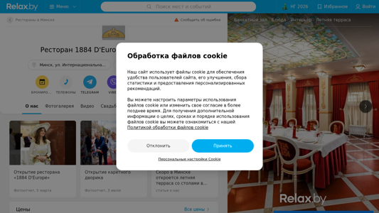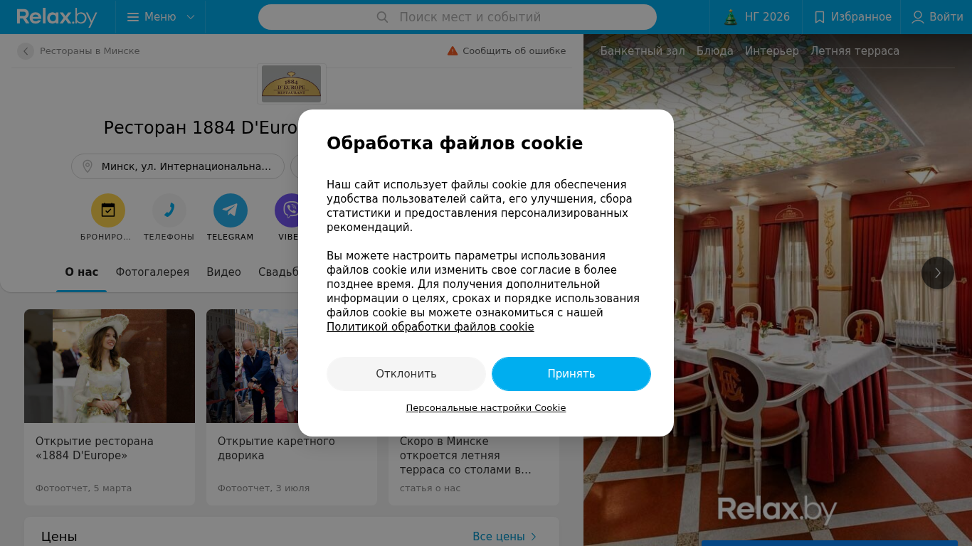 | SEO-описание | Ресторан 1884 D'Europe (1884 Де Европа) в Минске – отзывы, телефоны, адрес на карте, график работы и карта проезда на Relax.by. Ресторан в гостинице «Европа» в Минске: обзор. |