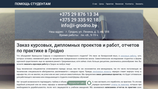 | SEO-описание | У нас можно заказать курсовые, дипломные проекты и работы, отчеты по практике. Помощь учащимся из Гродно и не только. Положительные отзывы, гарантии и сопровождение. |