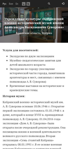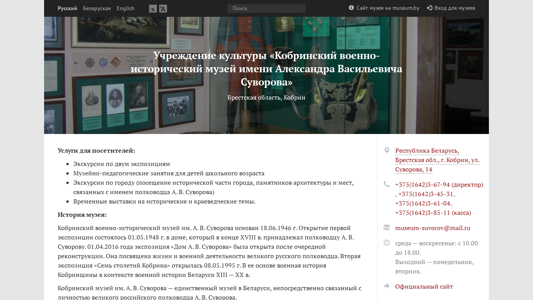 | AI-анализ | language: ru This online resource is the website of the Cobrin Military-Historical Museum named after Alexander Vasilievich Suvorov. The site provides news and event information, visitor details, prices, exhibitions, collections, and materials for museum professionals. The keywords include 'suvorova', 'museum', 'museums', 'cobrin', 'military-historical', 'military', 'history', 'culture', and 'belarus'. The top words are 'suvorova', 'museum', 'museums', 'cobrin', and 'military-historical'. The museum is located in Brest Oblast, Cobrin, and offers services for visitors such as guided tours of two exhibitions, museum-pedagogical activities for school-aged children, and city tours (visiting the historical part of the city, architectural monuments |