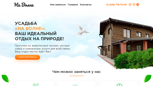| AI-анализ | --- This online resource is dedicated to Usadba "Na Volne" (On the Wave), a cozy agro-estate located in Vitsebskaya oblast, Belarus. The website offers opportunities for relaxation and fishing. Visitors can rent cottages and enjoy nature. The estate features picturesque trails for hiking, equipped banks for fishing, and facilities for various sports and team games. Boat rides and horseback riding are also available nearby. The website provides information on booking, contact details, and estate amenities. The estate is situated in a beautiful location, offering tranquility and peace. |