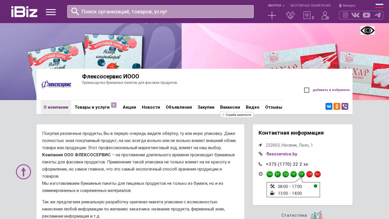 | Название / Заголовок | Флексосервис ИООО - Производство бумажных пакетов для фасовки продуктов.. 222603, Несвиж, , Лазо, 1 |