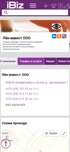| AI-анализ | The web project "Лён инвест ООО" is an e-commerce business specializing in clothing and textile products, as well as the manufacturing of wooden, metallic, and plastic components. The company is located in the Centralnaia Street, in the district of Kozly, Nezvizh District, Minsk Region, Belarus, with the postal code 222618. The contact details provided are three phone numbers: +375 (25) 737 93 xx, +375 (29) 313 11 xx, and +375 (25) 613 33 xx. The business hours are listed as Monday to Friday from 9:00 to 18:00, with no lunch break. The website offers various categories such as textile products |