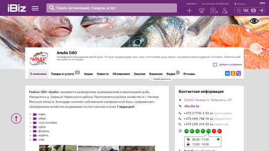 | AI-анализ | The portal Alba OAO specializes in the breeding and cultivation of live fish. It offers wholesale fish sales: carp, amur, tolstolobik, щуka, karas, som, rainbow trout. The site also provides information on fishing at four ponds. The address and contact information for Alba OAO is 222603, Nezvizh, K. Libknehta, 137. |