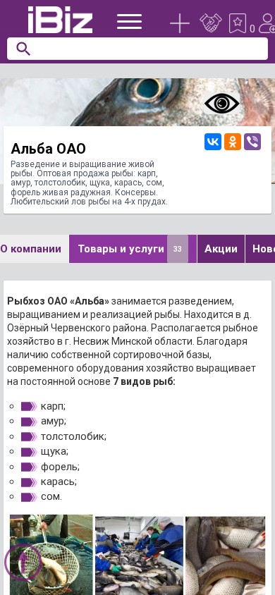 | Название / Заголовок | Альба ОАО - Разведение и выращивание живой рыбы. Оптовая продажа рыбы: карп, амур, толстолобик, щука, карась, сом, форель живая радужная. Консервы. Любительский лов рыбы на 4-х прудах.. 222603, Несвиж, , К. Либкнехта, 137 |