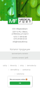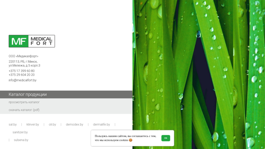 | AI-анализ | The website is for ООО "Медикалфорт" (LLC "Medicalfort"), a company located in Minsk, Belarus, at ul.Meleжа, d.5, corps.3. The website includes a catalog section, where users can view and download a PDF catalog of the company's products, including those sold under the brands sal.by, klinver.by, oli.by, demodex.by, dermalife.by, sanitizer.by, and sulsena.by. Users agree to the use of cookies upon accessing the site. |