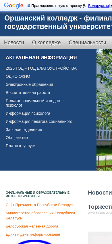 | AI-анализ | This online resource is the official website of Orshansky College - a filial of Belarusian State Transport University. The title of the website is "News - Orshansky College - filial of the educational institution 'Belarusian State Transport University'". The top keywords include "Orshansky College", "transport", "education", "information", "news", and "college". The website contains news about the college, specialties, admission administration, contacts, and practical information about accommodation, fees, and social services. It also includes links to various educational and official internet resources, such as the President of the Republic of Belarus' site, the Ministry of Education, and Belarusian Railways. The website was last updated on August 25, 2025, and includes information about the move-in dates for students in the dormitory, as well as details about |