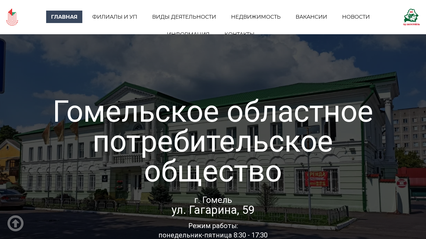 The website is a central hub for the Belarusian "Gomelskoe oblastnoe potrebiatel'skoe obshchestvo" (Gomel Regional Consumer Society), which is a multifaceted organization engaging in trading, procurement, production, and external economic activities, as well as supporting consumer cooperation in the GoMEL region of Belarus. The website provides information about the society's branches and affiliated enterprises, including the "Брагинский филиал", "Гомельский филиал", "Житковичский филиал", "Октябрьский филиал", "Лельчицкий филиал", and "Светлогорский филиал". These branches are involved in purchasing surplus agricultural produce from the population, developing a retail network and food service outlets, and exporting