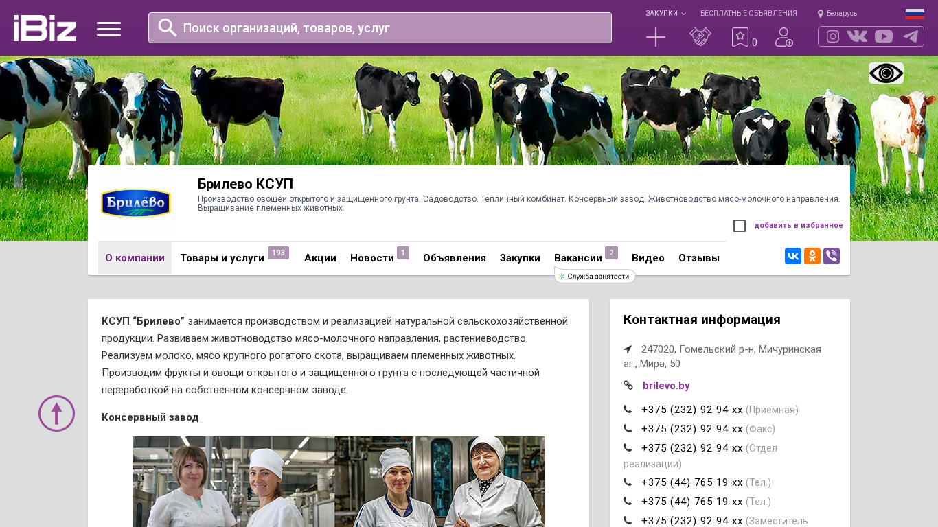| Название / Заголовок | Брилево КСУП - Производство овощей открытого и защищенного грунта. Садоводство. Тепличный комбинат. Консервный завод. Животноводство мясо-молочного направления. Выращивание племенных животных. . 247020, , Мичуринская аг., Мира, 50 |