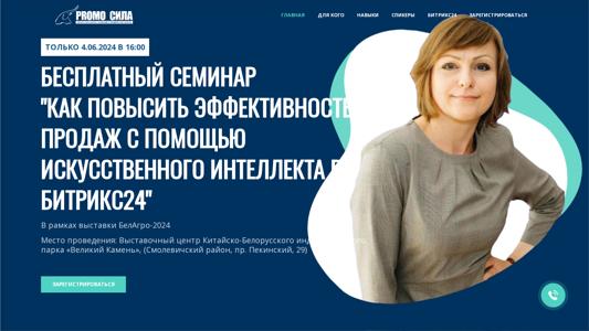 | AI-анализ | This website is an announcement for a free seminar titled "How to Increase Sales Effectiveness with Artificial Intelligence in Bitrix24" organized by OOO PromoSila. The seminar is part of the BelAgro-2024 exhibition and will take place at the Chinese-Belarusian Industrial Park "Great Stone," on June 4, 2024, from 16:00 to 17:00. The seminar is intended for business owners, top managers, and sales specialists who want to effectively utilize human resources, manage processes, and compete in a rapidly changing economic environment. Attendees can register for the seminar on the website and will learn how to streamline communications and operations across all company departments in a unified digital workspace, set up control and reporting systems for completed tasks, and evaluate the effectiveness of teams and individual employees. The seminar will |