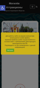 The web project "Могилёв Аттракционы" (Mogilev Attractions) is a Belarusian Open Stock Company (OAO) operating under the domain name mattraction.by. The website content is primarily in Belarusian language, with some sections available in other languages such as English. The website's title and description meta tags indicate that it is about Mogilev Attractions. The top keywords for this website include 'website', 'cookie', 'consent', 'gdpr', 'necessary', and 'user'. The website sets cookies for performance and user experience purposes, and users are informed of this through a consent banner. The website also has a tools panel for accessibility options, including text size adjustment and color contrast. The main sections of the website are 'Home', 'Hatka ORK "Печерск