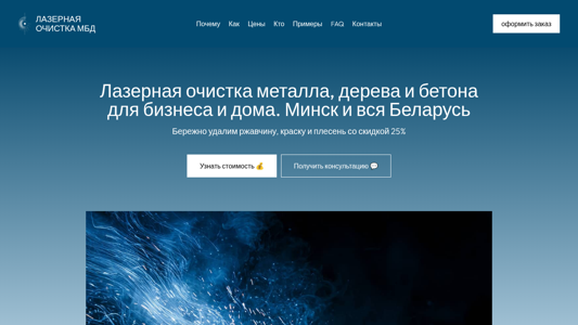 | AI-анализ | This online resource is dedicated to laser cleaning services for metals, concrete, and wood in Minsk, Belarus. It offers a discount of 25% and a free diagnosis for orders placed before the end of the week. The website provides information on laser cleaning for businesses and homes, including the benefits of laser technology, such as non-damaging removal of rust, paint, and mold. The website includes sections on FAQ, contact information, and an option to place an order. The laser cleaning process uses an impulse light to vaporize contaminants while leaving the underlying material unharmed, making it suitable for intricate areas and various surfaces. The cost of the service can be calculated within 5 minutes based on provided photos, and popular services include hourly rates and rental options. |