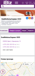 | AI-анализ | This website is for ZovMebelServis OOO, a Belarusian company located in Brest, at Карьерная 12, offering custom furniture services. The company produces and sells various types of furniture, including kitchens, wardrobes, children's furniture, living room sets, and bedroom sets. The website provides a contact scheme, phone numbers, and the company's address. The business operates Monday through Sunday from 10:00 to 17:00 without lunch breaks. |
