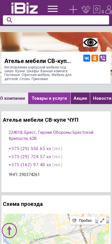 | Название / Заголовок | Ателье мебели СВ-купе ЧУП - Изготовление корпусной мебели под заказ. Кухни. Шкафы. Ванная комната. Гостиные. Офисная мебель. Мебель для детской. Столы. Прихожие. . 224018, Брест, , Героев Обороны Брестской Крепости, 62В |