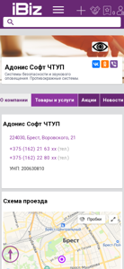 AI-анализ | The web project "Adonis Soft ЧТУП" is a company based in Brest, Belarus, located at Воровского 21. The website offers security systems and sound alerting solutions, specializing in burglar alarms. The company's contact information includes phone numbers +375 (162) 21 63 xx and +375 (162) 22 80 xx. The business hours are Monday to Friday from 9:00 AM to 6:00 PM, with no lunch break. The company is listed under the categories of "Security Systems and Signal Alarms" and "Security Systems in Brest." |