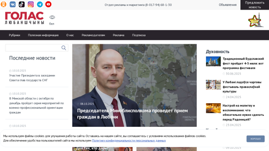 | AI-анализ | The web project "Голас Любаншчыны" (Voice of Luban) is a news and information platform dedicated to the city of Luban and Lubansky region in Belarus. The website features news, job listings, blogs, forums, and a photo gallery. Keywords associated with the site include "news," "work," "blogs," "forums," and "photo gallery." The top words used on the site are "2025," "best," "region," "best," "pride," "dajynak-2025," "Belarus," "citizens," "October," "president," "sng," "will," "victory," "column," "Lubansky," "workers," "Lubansky," "kaleidoscope," "connections," "101 |