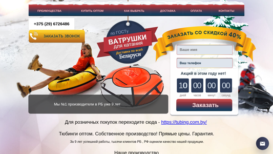 | AI-анализ | The website i-tubing.by is an e-commerce platform specializing in the sale of tubing products. The homepage is titled "ТЮБИНГИ ОПТОМ - Tubing OPT," with a description that includes keywords such as "камера," "запрос," "производство," and "пвх-покрытием." The site offers sumps for tubing, which are priced at 130 rubles for the base model and 190 rubles for a more expensive version. The site also mentions being the number one producer in Belarus for the past nine years and having a successful track record with thousands of clients in Belarus and Russia. The site claims to have automated its production line to improve efficiency and quality, and to have exclusive deals with manufacturers of automobile cameras. The site also warns against counter |