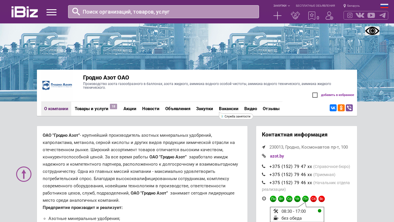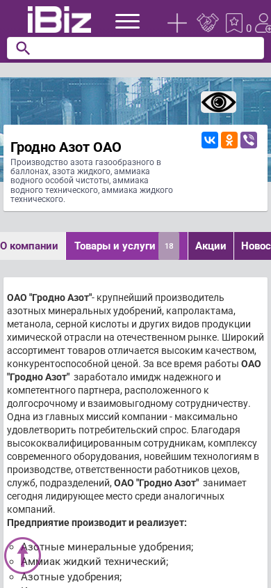 | AI-анализ | The website is for Grodno Azot OAO, a company based in Grodno, Belarus, producing gaseous ammonia in bottles, liquid ammonia, anhydrous ammonia, ammonia water of special purity, ammonia water of technical purity, and liquid ammonia of technical purity. The company's address is given as Cosmonauts pr-t, 100. The website provides information about the company, its products, and services, as well as contact details and a map for visiting. Grodno Azot OAO is a major producer of mineral fertilizers, caprolactam, methanol, sulfuric acid, and other chemical products in Belarus. The company's product range is known for its high quality and competitive pricing. Grodno Azot OAO has built a reputation as |