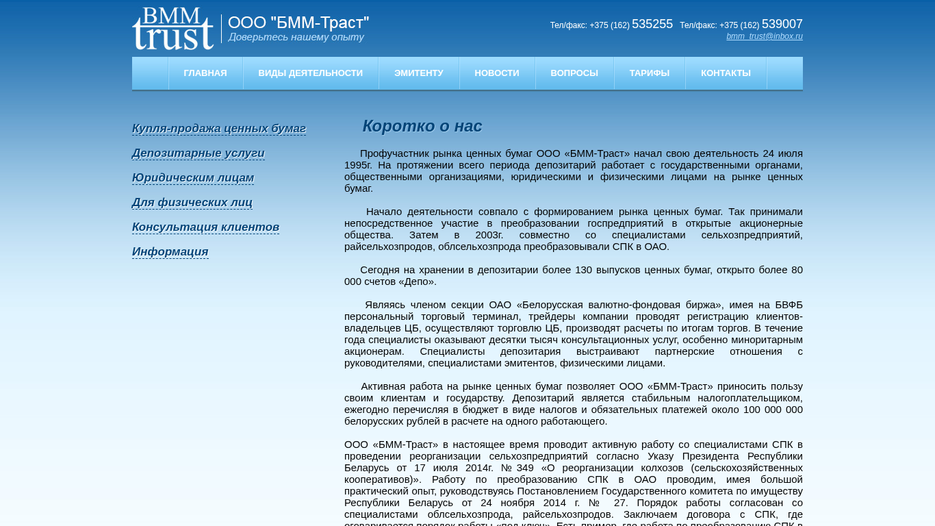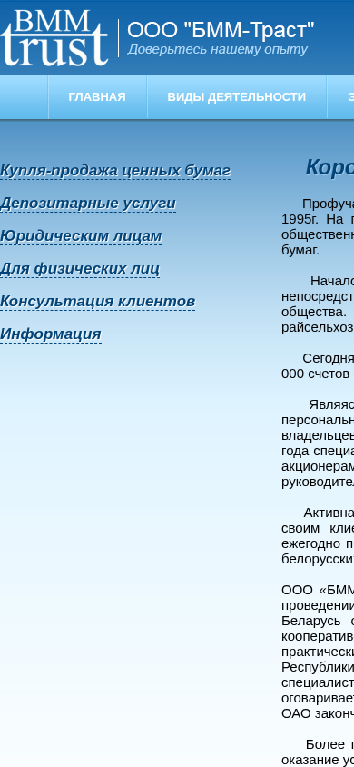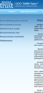 | AI-анализ | This online resource, titled "Главная," is a website dedicated to the Belarusian Open Joint Stock Company (OJSC) "БММ-Траст" (BMM-Trust), which began its activity in the securities market on July 24, 1995. Over the years, BMM-Trust has worked with government organizations, public institutions, legal entities, and individuals in the securities market. The company's inception coincided with the formation of the securities market. BMM-Trust played an active role in transforming state-owned enterprises into open stock companies. Later, in 2003, BMM-Trust collaborated with agricultural production enterprises, rural agricultural product cooperatives, and regional agricultural product cooperatives to convert collective farms into open joint-stock companies. Today, more than 130 securities issues |