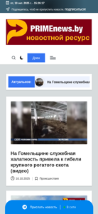 | AI-анализ | The portal Prime News (primenews.by) is a news resource for residents of Homiel and Belarus. The website provides news on various topics including local news, exclusive news, economics and finance, health, technology, sports, and useful information. The content is updated regularly, with articles published on topics such as a serviceman's neglect leading to the death of livestock, planned power outages in the Rechitsk district, weather forecasts, the implementation of electronic certificates, traffic accidents, and court cases. The website also features videos related to these topics. |